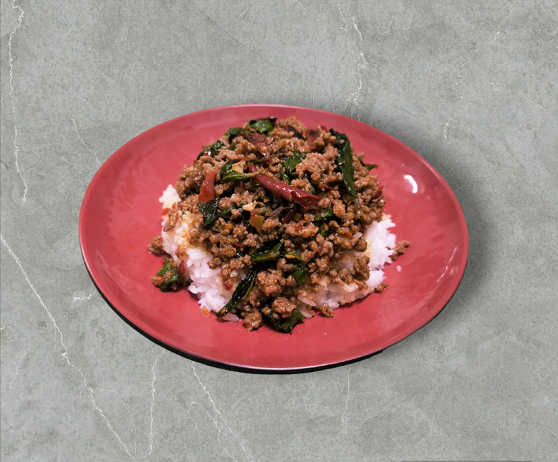 ทางร้านขายเนื้อวัวเป็นหลัก และใช้กะเพราแดง และพริกแห้ง เพื่อความหอมและเผ็ดร้อน อาหารฮาลาลนะคะ