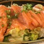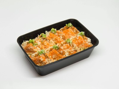 โรลสไตล์แซนวิช ไส้ปลาแซลม่อน คลุกด้วยไข่กุ้งและเกล็ดเทมปุระ ราดซอส 2 อย่าง