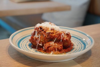 มีทบอล เนื้อแกะ เสิร์ฟพร้อมกับซอสมะเขือเทศ และใส่ชีสเพโคริโน่ โรมาโน่