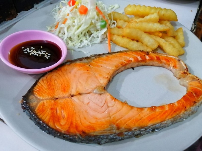 ช่วงนี้หิวเมื่อไหร่ก็เปิดแอพสั่งตลอด เมื่ออยากกินสเต๊กแล้วเปิดมาเจอร้านนี้ เห็นราคากลางๆ เมนูให้เลือกเยอะดี -สเต๊กปลาดอลลี่ & ไส้กรอก (149.-): ปลาย่างมากำลังดี แต่แอบมันๆไปหน่อย ไม่รุ้มันจากน้ำมันกระทะหรือซอสค่ะ -สเต๊กปลาแซลม่อนย่าง(159.-) ปลาชิ้นใหญ่ดี รสชาติกลางๆ ถือว่าคุ้มค่ากับราคาอยู่ค่ะ แล. สามารถใช้สวัสดิการรัฐผ่านไลน์แมนได้ค่ะดูเพิ่มเติม