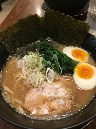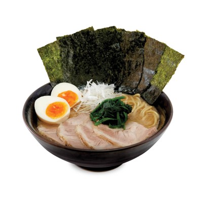เส้นราเมนกลม หอมน้ำซุปกระดูกหมู พิเศษด้วยท้อปปิ้งหมูชาชู 4 ชิ้น ไข่ยางมะตูม ตกแต่งด้วยผักปวยเล้งและสาหร่าย