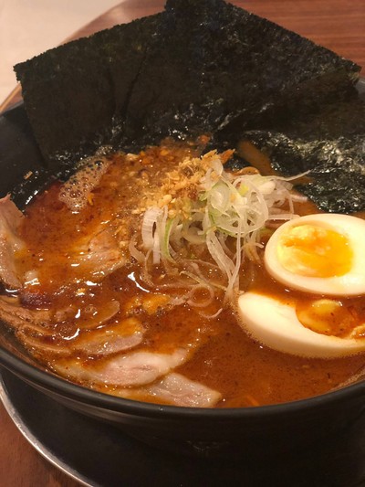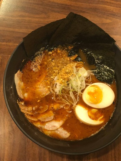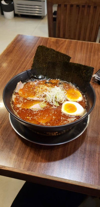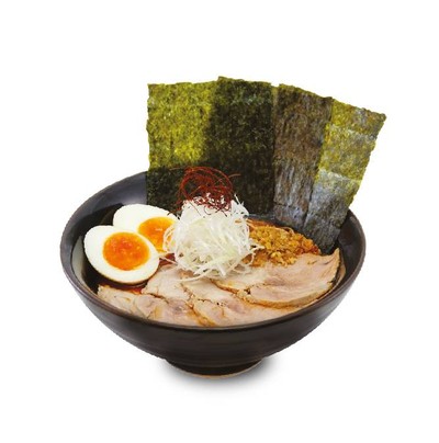 ราเมนเส้นเรียวเล็กในน้ำซุปสีแดง พิเศษด้วยท้อปปิ้งหมูชาชู 4 ชิ้น ไข่ยางมะตูม โรยหน้าด้วย ถั่วงอก ต้นหอมซอย เห็ดหูหนูปรุงรส และสาหร่าย