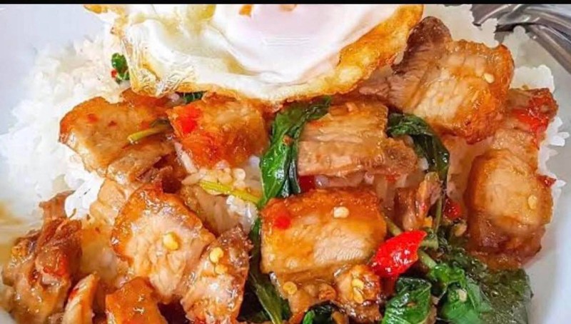 กะเพราถาดพริกแห้งสูตรคุณแม่(ใช้ข้าวหอมมะลิแท้ตราไดโนเสาร์)