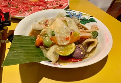 A classic Lao papaya salad with thick-cut papaya strands and our house-made Pla-Ra