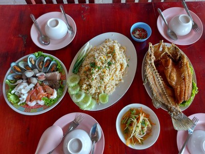ร้านนี้ให้คะแนนตรงบรรยากาศริมทะเล ลมเย็นๆ ส่วนอาหารสำหรับเราคือไม่ผ่านเลย ตอนแรกมาหน้าตาดูน่ากิน แต่พอกินแล้วรสชาติไม่ได้เลย อาหารโดยรวมคือรสหวานมาก ปลากะพงนึ่งมะนาวคือจืดมากทั้งๆ ที่ควรจะมีรสแซ่บเปรี้ยว ยำไข่แมงดาคือเปรี้ยวปรี้ดดดดดมาก ไข่เจียวฟูปูหลบใน คือไข่กรอบดี แต่เนื้อปูที่อยู่ข้างในมีเปลือกเยอะมากกินไปกรุบๆ เคี้ยวๆ คายๆ มีอันที่พอจะกินได้คือแกงส้ม แต่ก็ยังติดหวานนิดๆดูเพิ่มเติม