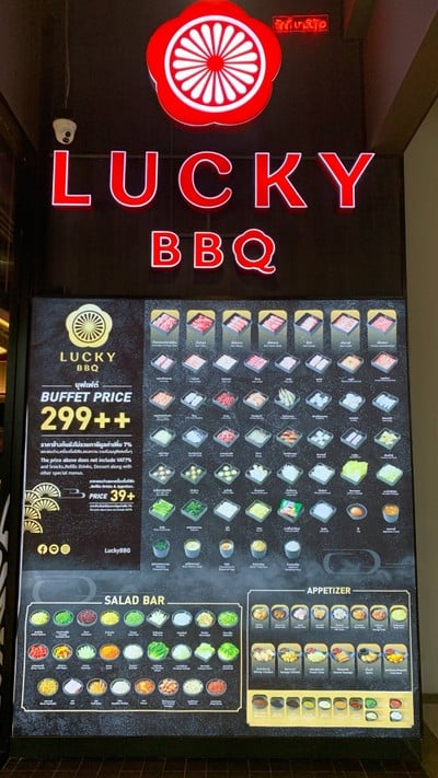 มาที่เดียวเลือกได้เลยค่ะว่าจะทาน BBQ หรือ SUKI ลัคกี้พร้อมบริการทั้ง 2 รูปแบบ สุกี้ทานร้านข้างล่าง BBQ ทานร้านด้านบน ป้ายราคา 299++ รวมเครื่องดื่ม รวม VAT จบที่ 361.66 ไลน์อาหารคุณภาพดีค่ะ เนื้อ หมู กุ้ง ปลาหมึก สลัดบาร์ อาหารทานเล่น แต่ไม่มีผลไม้ ส่วนไอศครีมต้องชำระเงินเพิ่มค่ะ ไปวันธรรมดามื้อเที่ยงไม่ต้องรอคิวค่ะดูเพิ่มเติม