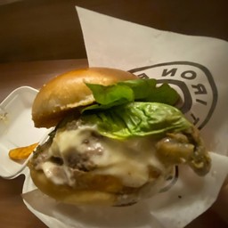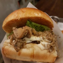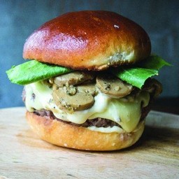 Burger bun, Patty, Swiss cheese, Sauteed mushroom with onion, Mixed green, Truffle aioli (Galic mayo), Served with skin-on wedges