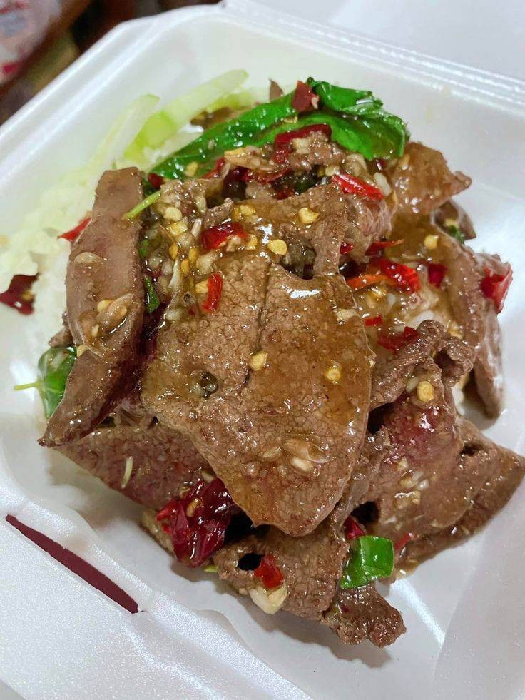 กะเพราถาดพริกแห้งสูตรคุณแม่(ใช้ข้าวหอมมะลิแท้ตราไดโนเสาร์)