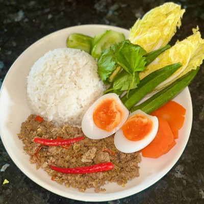 อาหารตามสั่ง นวลศรี กะเพราถาด ข้าวหมูทอด