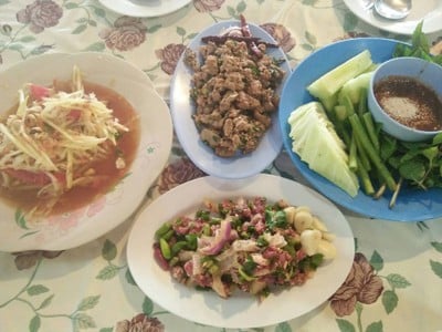 ร้านอาหารอีสานแบบไม่มีกลิ่นอายเมืองเหนือค่ะ ก่อนออกจากตัวเมืองน่านมีร้านอาหารเด็ด แวะได้ไม่ผิดหวังค่ะ เมนูอีสานทั่วไป ส้มตำ ลาบ ต้ม ย่าง ยำ ที่ขึ้นชื่อก็ลาบเป็ด เป็ดน้ำดีค่ะ เราเคยมากินเป็ดน้ำดีที่นี่ครั้งแรก รวชาติจะขมๆค่ะ แต่พอกินเสร็จแล้วอยากกินอีกอ่ะ 555 มันเป็นความขมที่อร่อยอ่ะค่ะ กินกับข้าวเหนียว ซดต้มแซ่บๆ ร้อนตามไปอีก ได้รสชาติดีจริงๆค่ะ ร้านก็สบายๆ โต๊ะเก้าอี้พลาสติกค่ะ มีโซนห้องแอร...อ่านต่อ