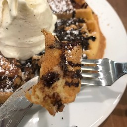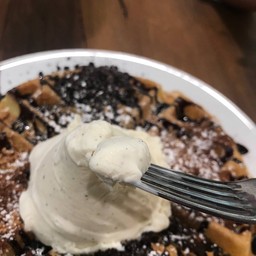ดูจากในเน็ตแล้วตามมากิน ดูหน้าตาตอนแรกนึกว่าจะเป็นวาฟเฟิลแข็ง ๆ เหมือน a&w แต่จริง ๆ ไม่ใช่ ออกจะนุ่ม ๆ หอม ๆ มีหลายเมนูให้เลือก บางอันจะเป็นแป้งธรรมดา อย่างที่สั่งมาคือ Muddy Buddy แป้งจะมีช็อคชิปในเนื้อแป้ง โรยด้วยผงไมโล ผงโอรีโอ้ ราดช็อคโกแลต หวานอร่อยสะใจ ไอติมมีให้เลือกหลายรส ที่สั่งมาเป็นวานิลาบีน ออกหวาน แต่รวม ๆ กินกับวาฟเฟิลแล้วอร่อยดีดูเพิ่มเติม
