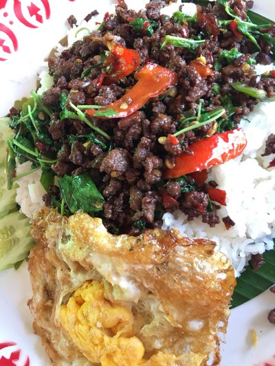 ใช่ครับ ผัดกระเพราธรรมดาๆรสชาติกลางๆเอามาใส่ถาดนี่ละครับ สนนราคาเริ่มต้น กระเพราหมูไข่ดาว 40 บาท ถ้าเป็นเนื้อ 50 บาท ปริมาณเยอะมากกก 2คน 1ถาด ผมว่าพอดี ข้าวเยอะ กับที่ให้มาก็ไม่น่าเกลียดจนเกินไป (ราคาผมไม่แน่ใจนะครับเพื่อนจ่ายมันบอกมาแบบนี้ อิ อิ) มีน้ำซุป เกี๊ยวทอดฟรี บริการตนเอง แต่ต้องไปไวหน่อยไม่งั้นหมด ส่วนด้านรสชาต กระเพราผัดออกมาได้กลางๆแห้งๆออกไปทางจืดถือว่าพอใช้ได้ในระดับนึง อีกจานน...อ่านต่อ