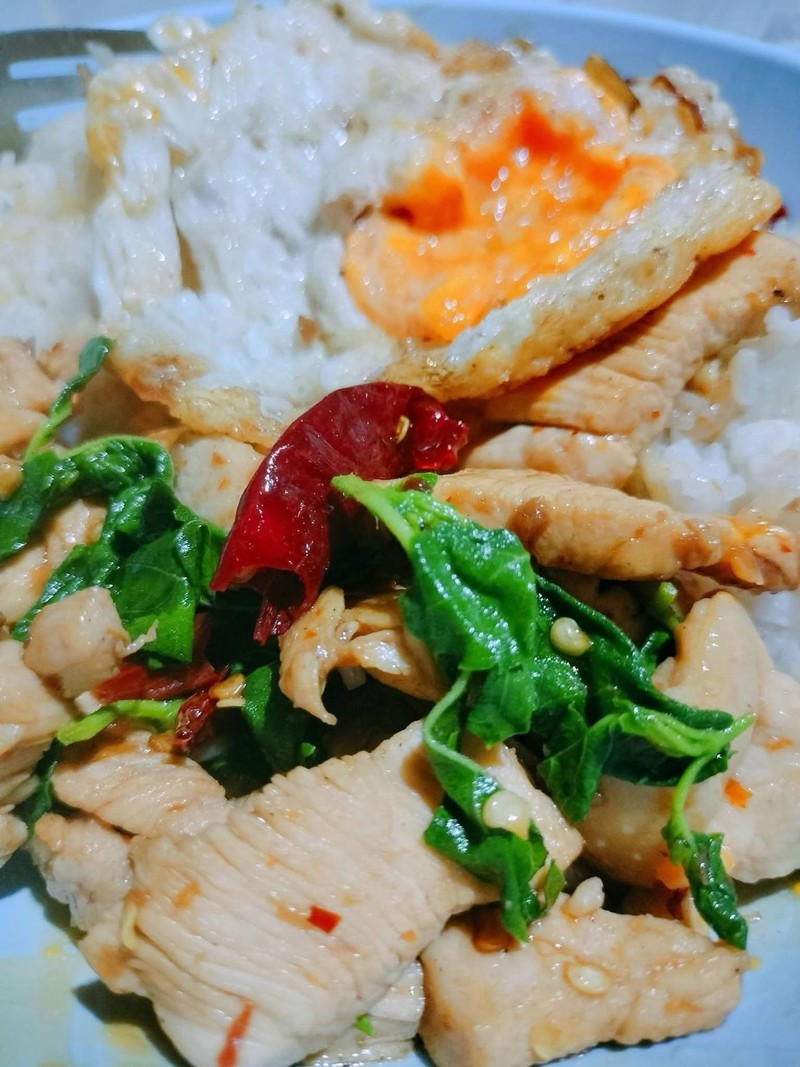 กะเพราถาดพริกแห้งสูตรคุณแม่(ใช้ข้าวหอมมะลิแท้ตราไดโนเสาร์)