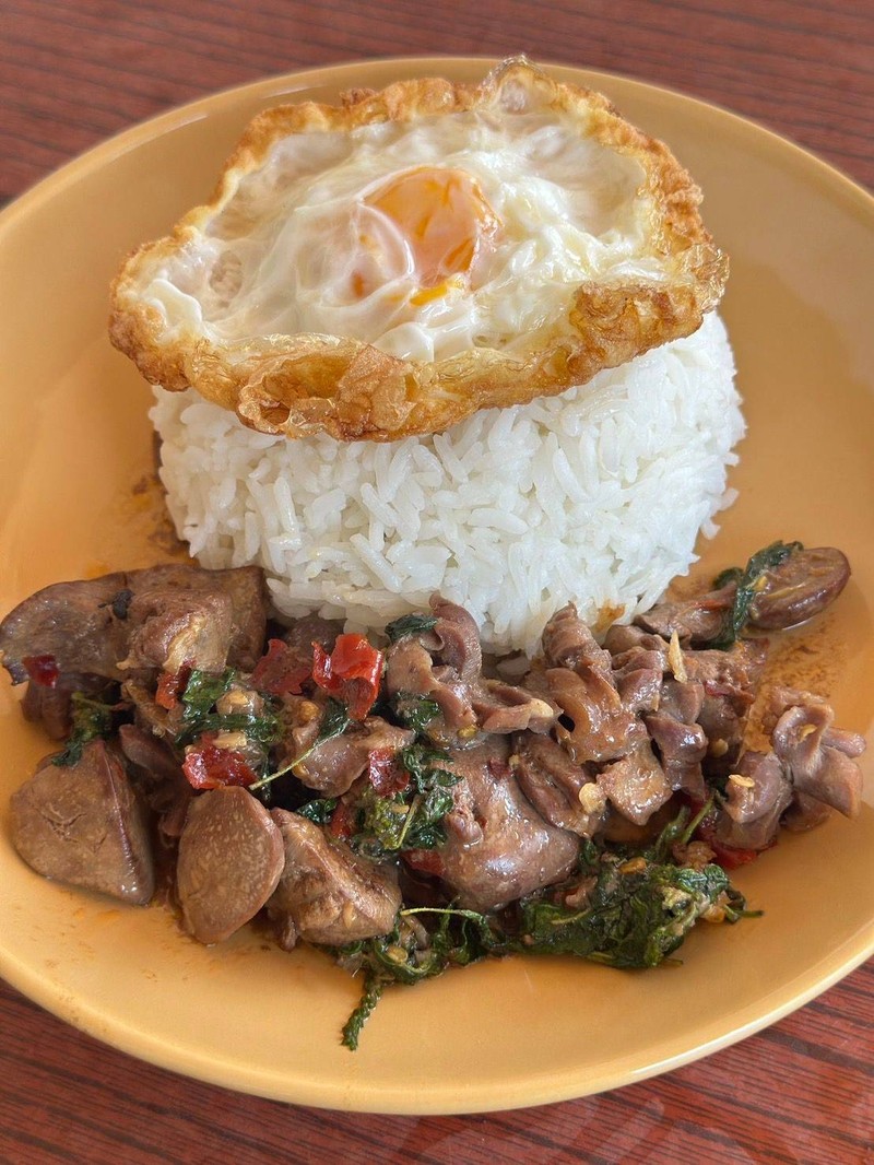 กะเพราถาดพริกแห้งสูตรคุณแม่(ใช้ข้าวหอมมะลิแท้ตราไดโนเสาร์)