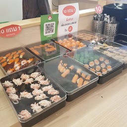 ร้านซูชิ เป็นตึกแถวสองคูหา อยู่ริมถนนหลักครับ ที่จอดรถต้องจอดเอาริมถนนครับ ร้านจัดโปรโมทชั่นอยู่นะครับ 10 ชิ้น ฟรี 1 ชิ้น รายการอาหารก็จะเป็นซูชิหน้าต่างๆ เริ่มต้นที่ 10 บาทครับ ขยับขึ้นไป 15 บาท และ 20 บาท แล้วแต่หน้าของวัตถุดิบครับ ส่วนรายการิาหารเพิ่มเติมมีไม่เยอะครับ ก็ลองสั่งมาครับ "แซลมอลซาซิมิ" "ยำแซลมอนแซ่บ" ก็สดใหม่ดีครับ ชิ้นแซลมอนหันมาไม่หนา น่าจะหันชิ้นหนากว่านี้อีกสัดนิดก็กีนะครับผ...อ่านต่อ