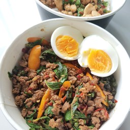 ร้านนี้กลายเป็นร้านกะเพราประจำบ้านที่สั่งบ่อยๆเวลาอยากกินกะเพราไปละค่ะ ทางร้านมีกะเพราหลากหลายแบบ ชอบทั้งกะเพราเทพหมู, กะเพราดิบเถื่อนเนื้อโคขุน แต่ถ้าเป็นไก่ เราก็ชอบกะเพราไก่ซุปเปอร์ เพราะเค้าใช้ไก่เบญจา ตัวไก่จะหนึบๆกว่าเมนูไก่แบบธรรมดา พอดีอยากลองไข่ยู่ยี่ด้วย ว่าเป็นไงเลยสั่งมาด้วย สรุปมันคล้ายไข่คนใส่หมูสับ อร่อยดีนะ กินคู่กันเลยสองเมนูอร่อยดีค่ะดูเพิ่มเติม