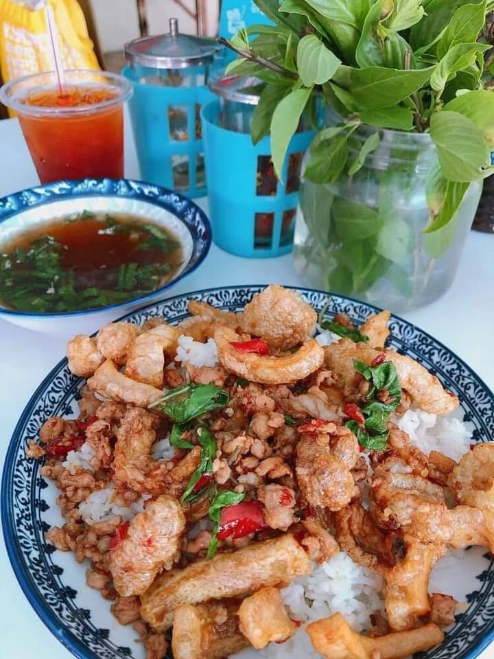 กะเพราถาดพริกแห้งสูตรคุณแม่(ใช้ข้าวหอมมะลิแท้ตราไดโนเสาร์)