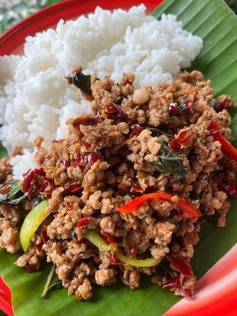 กะเพราถาดพริกแห้งสูตรคุณแม่(ใช้ข้าวหอมมะลิแท้ตราไดโนเสาร์)