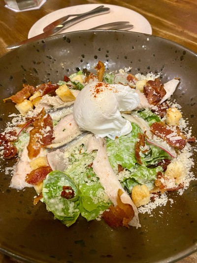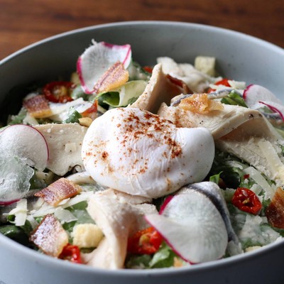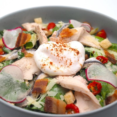 ผักคอสโรเมนคลุกเคล้ากับน้ำสลัดซีซ่า ที่มีกลิ่นหอมของ White Anchovy และกระเทียมพร้อมด้วยอกไก่สไลด์ โพชเอ้ก โรยด้วยเบคอนกรอบ กรูตองซ์ Garlic Oil และพาเมซานชีส