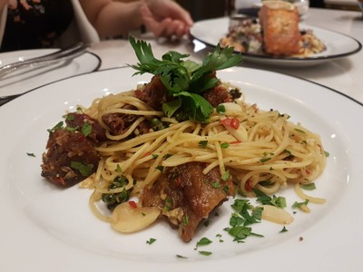ร้านนี้ทานตั้งแต่เรียนมหาลัยยันทำงาน เมนูโปรดก็พาสต้าผัดกับขาหมูกรอบ อร่อยโคตร เผ็ดนิดๆ เค็มหน่อย หมูกรอบกรุบมาก หอมน้ำมันมะกอกอ่อนๆ แต่หลังๆ มารู้สึกปริมาณจะล่อยหรอลง จนไม่อิ่มมมมมมม นอกจากนี้ เมนูเครปก็อร่อย เลือกหน้าตามใจชอบเลยฮะดูเพิ่มเติม