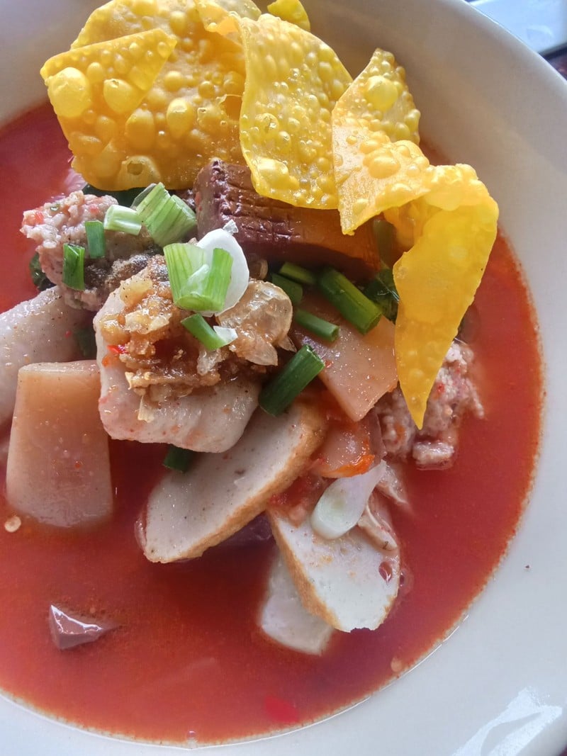 Tom Yum Noodles with Crispy Pork Traditional Recipe Thanyaburi