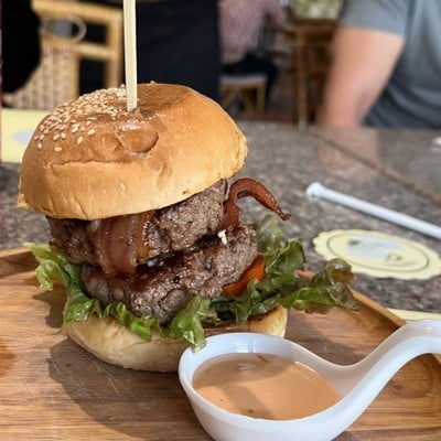 เบอร์เกอร์ต้นตำรับ เนื้อดรายเอจ 200 กรัม (2 ชิ้น), เบคอน, หอมผัด, มะเขือเทศ และผักสลัด