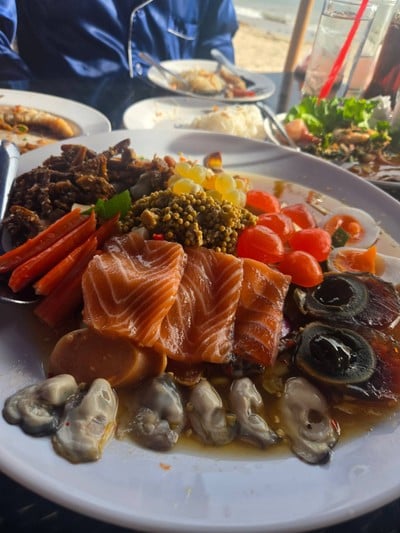 ก่อนกลับกรุง ขอแนะนำร้านอาหารริมทะเล หาดวอนนภา กับร้าน " เจ๊ดาว ซีฟู๊ด ริมเล หาดวอน " ร้านที่ตั้งอยู่ริมทะเลแบบใกล้ชิด เดิน 5 ก้าวลงทะเลได้เลย เมนูที่ขอแนะนำให้สั่ง หากมา 2-4 คน เราว่าพอดีกินน้องจานนี้ คือ น้อง ยำรวมหาดวอน 450฿ ราคานี้มี แซลมอน หอยนางรม หอยแครง กุ้งสด ปูทะเลดอง 1 ตัว ไข่ต้ม ไข่เยี่ยวม้า ไข่แดงเค็ม ไข่แมงดา ไข่ปลาริวกิว มะม่วง ข้าวโพด ไส้กรอก ปูอัด หมูยอ ปลากรอบ และคือแทบทุกอ...อ่านต่อ