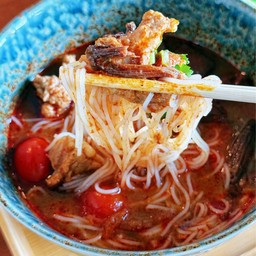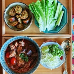 很喜欢这家小店,就像是一个可爱的小书屋,这里有好多卡牌游戏和大富翁之类的,可以带朋友一起玩,店主很亲切,就像是老朋友来家里吃饭。 食物只在周五周六周日提供,价格超便宜,好久没有吃到清莱的食物了,推荐这家店! 🌶️ขนมอีแน้ำเงี่ยว泰北米线(70泰铢):味道偏辛辣,但是也没有那么辣,而且我喜欢木棉花的味道和猪血,米线吸收了汤汁也很好吃。 🧆สสั่วเชียงราย (60泰铢):喜欢这种充满香料的香肠,不止有肉的单调,还有各种香辛料! 💖粉红奶(65泰铢):就比较平常的甜牛奶,但是好适合今天的心情。ดูเพิ่มเติม