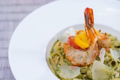 เฟตตูชินีเพสโตซอส กุ้งย่างและพริกหวาน