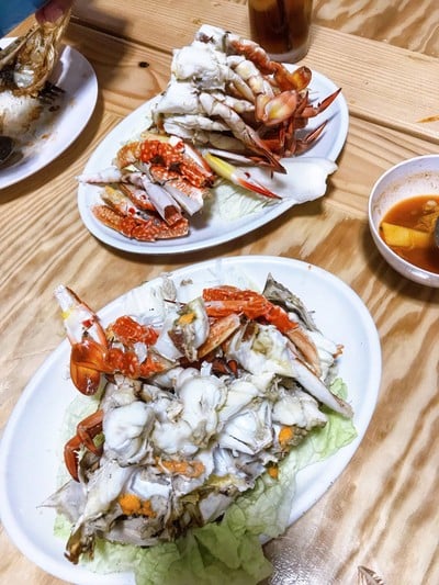 ปูม้านึ่งแกะเราจะเป็นปูมาเป็นๆสดๆแล้วนึ่งให้แกะให้พร้อมรับประทานมีน้ำจิ้มซีฟู๊ดมะนาวสดให้พร้อม
