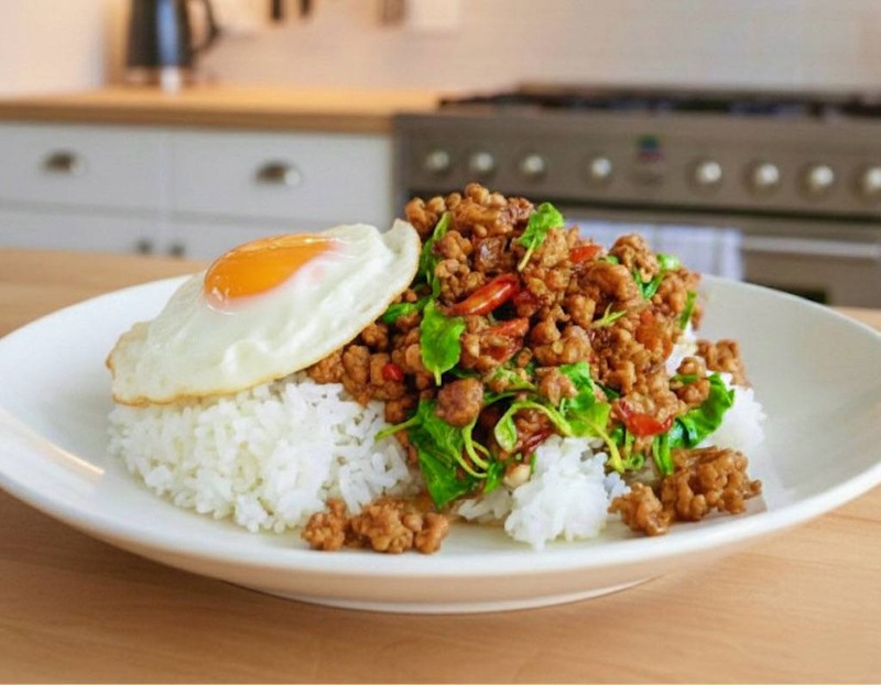 เอวา ข้าวกะเพราพริกแห้ง&ลูกชิ้นนึ่ง&เครื่องดื่ม