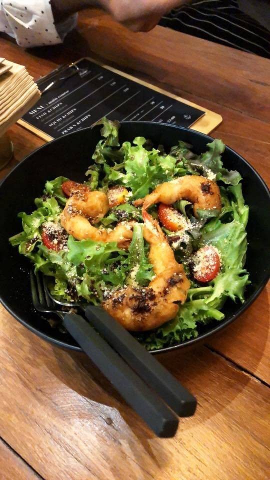 เมนูเด็ด: ปลากระพงขาวชิ้นโต กับ มันทอด, Salad with Prawn