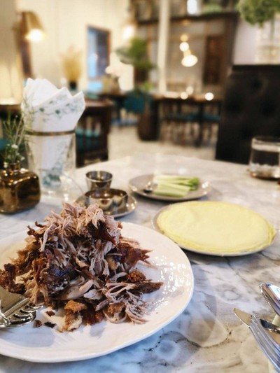 คราวก่อนเคยรีวิวไปแล้วว่า "เกล็ดหิมะบัวลอยเผือกไข่เค็ม" ของร้านนี้เด็ดมาก ดีมาก อร่อยมาก ฟินมาก (ไปตามอ่านรีวิวกันได้นะคะ ว่าเด็ดยังไง) แต่สำหรับครั้งนี้ ขอแนะนำอีก 1 เมนู คือ "เป็ดซุย" อารมณ์ก็คล้ายๆ เป็ดปักกิ่งอยู่นะ แต่เนื้อและหนังเป็ดเค้าจะฉีกมาให้แล้ว มีความนุ่มๆ ฟูๆ ไม่เหนียว กินง่าย กินกับต้นหอมและแตงกวา ราดด้วยน้ำเป็ดและน้ำจิ้มซีอิ๊วดำ แล้วห่อด้วยแป้งปอเปี๊ยะ อร่อยดีค่ะ กินสนุกดีด้วยดูเพิ่มเติม