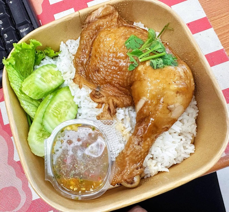 ร้าน ข้าวกล่อง59 กระเพรา ไก่ต้มน้ำปลา (ข้าวไข่เจียว ต้มยำ) ซุ้มอาหารสีเขียวตรงข้ามร้านอ้อยเป็ดย่าง
