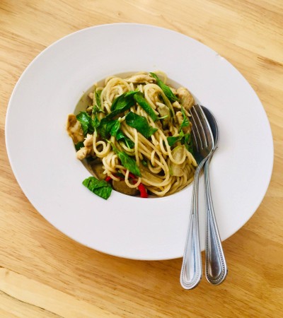 Nueng Food Cafe 1 ฟู้ดคาเฟ่ ร้านอยู่บนถนนศรีอยุธยาตรงข้ามโรงเรียนสันติราษฎร์บำรุง เลยทางขึ้นสะพานมาเล็กน้อย ร้านไม่มีที่จอดรถแต่ช่วงกลางวันสามารถไปจอดในโรงเรียนแบบเสียเงินแล้วเดินข้ามถนนมาทานได้ เมนูที่ได้ลองวันนี้ก็มี สปาเกตตี้เขียวหวานไก่ 90฿ เส้นลวกมาดียังเด้งในปาก ได้กลิ่นแกงเขียวหวานโชยมา จานนี้ใส่เครื่องเทศมาครบ ทั้งมะเขือ ใบมะกูด ใบโหระพาและพริกแดง ไก่เนื้อนุ่มให้มาเยอะ แกงเขียวหวานรสชา...อ่านต่อ