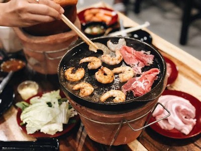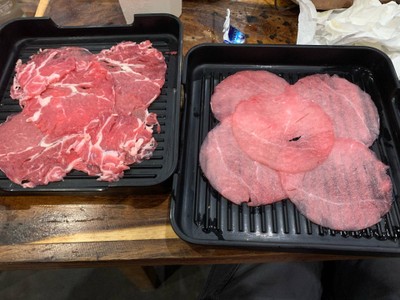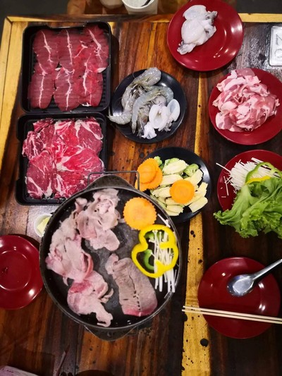 มาร้านช่วง 4 โมงเย็น คนยังไม่เยอะแต่ถ่านก็ยังไม่ร้อนมาก เลยยังย่างอะไรได้ช้า อาหารติดกระทะนะ ต้องมีเนยทา แต่ใส่เยอะก้กระเด็น เนื้อสั่งจากน้องพนักงาน สไล้มาขาดบ้างบวกกับติดกระทะด้วย ต้องใช้ความสามารถหน่อย อาหารอร่อย น้ำจิ้มมีให้เลือก 4 แบบ ลองชิมดูว่าถูกใจอันไหน ราคา 199 ไม่รวมน้ำนะดูเพิ่มเติม