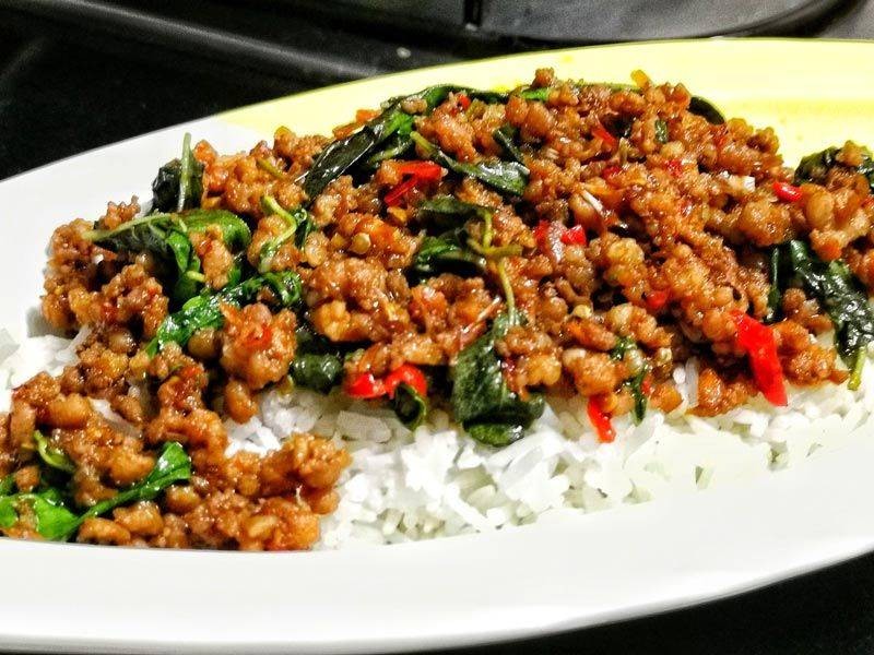 กะเพราถาดพริกแห้งสูตรคุณแม่(ใช้ข้าวหอมมะลิแท้ตราไดโนเสาร์)