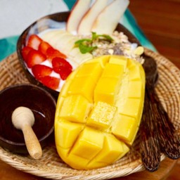 ร้านนี้ตกแต่งสไตล์บาหลี แบบชิล ๆ เมืองร้อน ภายในร้านใช้เฟอร์นิเจอร์หวาย ดูธรรมชาติ มีให้เลือกนั่งทั้งด้านในและด้านนอก เราเลือกด้านนอก เพราะได้ความชิล ริมสระน้ำ เตียงผ้าใบ มีมุมนั่งเก้าอี้หวายให้เลือกหลายจุด เมนูของร้านเป็นเมนูขนมและเครื่องดื่มที่เน้น ผลไม้สด โยเกิร์ต เราลองสั่ง sweet & sour 89.- : เป็นเมนูกล้วยปั่น ตัดกับสตอเบอร์รี่ปั่น รสชาติหวานตัดเปรี้ยว ลงตัว ได้ความหอมจากกล้วยกำลังดี ...อ่านต่อ