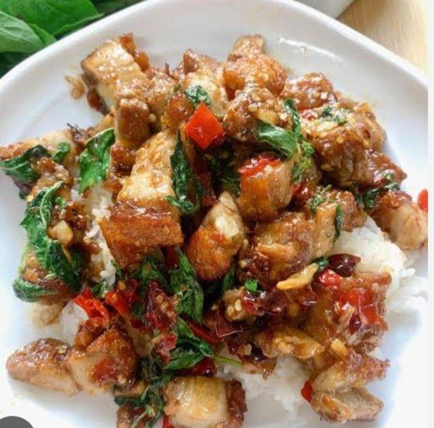 กะเพราถาดพริกแห้งสูตรคุณแม่(ใช้ข้าวหอมมะลิแท้ตราไดโนเสาร์)