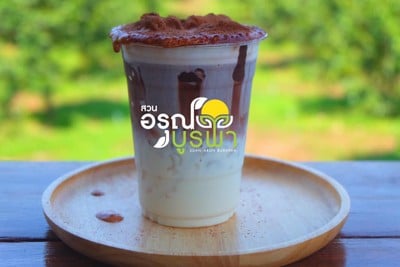 กลางเดือนกรกฏาคม เมื่อผลไม้ต่างๆใกล้หมดฤดูแล้ว แต่สวนอรุณบูรพานี้ยังไม่อ้างว้าง มีคาเฟ่เปิดบริการให้คนตกฤดูอย่างเราเข้ามาชื่นชม ร้านอยู่ชั้น 2 สวนล้อมรอบเขียวชอุ่มสบายตา จะนั่งหรือจะนอนชิลล์ก็ได้ เมนูกาแฟ โกโก้ ชา ส่วนเค้กมีหลากหลายน่าตาดีทั้งนั้น และรสชาติก็ใช้ได้เลยทีเดียว โดยเฉพาะทุเรียนชีสเค้ก ห้ามพลาด!!! ป.ล.ถ้าไปเที่ยวนอกฤดูผลไม้ โทรเช็คเวลาเปิด-ปิดร้านด้วยน๊าดูเพิ่มเติม