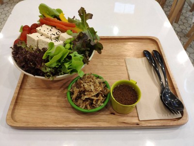 สั่งอาหารหน้าร้าน แล้วค่อยไปนั่งในร้าน กินเสร็จเอาถาดไปคืนที่เคาเตอร์เอง สลัดเต้าหู้ 109 บาทได้เต้าหู้ใหญ่ดี ผักกรอบ ไม่ขมมาก ลองสั่งมากับน้ำสลัดงายูสุ ปลาโอ ได้ปลาโอแยกออกมา น้ำสลัดไม่เค็มมาก หอมกลิ่นยูสุชัดเจน ยิ่งถ้าเอาปลาโอใส่ลงไปคลุกกินกับสลัดจะยิ่งอร่อยขึ้น ข้อเสียคือ ชามเล็กไปคุกสลัดไม่ได้เลยดูเพิ่มเติม