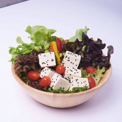 ผักสลัดสดกรอบเต็มจาน เสิร์ฟพร้อมเต้าหู้จุก และน้ำสลัดสูตรพิเศษจากเหลือใจ