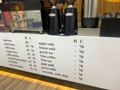 ร้านอยู่ชั้น B1 อาคารนวมินทร์ มีที่นั่งประมาณ 4-5โต๊ะ ร้านเปิดสายหน่อยนะ ไปตอนเช้าร้านกาแฟโซนด้านในเปิดแล้ว เมนูเยอะ กาแฟ ชา และเครื่องดื่มที่ผสมแบบต่างๆ ราคาไม่แพง จะมีโต๊ะที่มีวางถังขยะขนาดเล็ก และsyrup ให้เติมเอง เมนู Espresso เพื่อนบอกกาแฟหอม เข้มข้นดีมาก Iced Latte อันนี้ธรรมดา หอมกำลังดี Thai Tea ชากลิ่นไม่หอม ไม่ขม คล้ายๆชาของอเมซอน เลยไม่ค่อยถูกใจดูเพิ่มเติม