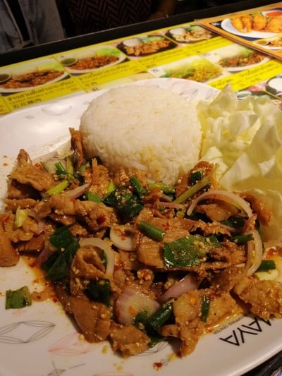 ร้านนี้มีเมนูอาหารหลากหลายให้เลือกตั้งประธานครับมองจากป้ายหน้าร้านแล้วมีเยอะมาก จนเลือกไม่ถูกกันเลยครับผม วันนี้สั่งเป็นเมนูข้าวหมูน้ำตกปริมาณที่ได้รับคือเยอะมากอย่างในรูปเลยคุ้มค่าครับแต่รสชาติที่ได้รับนั้นก็แซ่บอยู่แต่อยากให้ลดระดับความเปรี้ยวลงสักเล็กน้อยจะยอดเยี่ยมเลยดูเพิ่มเติม