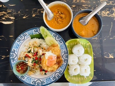 ขนมจีนเส้นสด อร่อยมากๆ น้ำยาเยอะมากกกก เลือกได้ตามชอบ อาหารจานเดียวหลากหลาย กะเพรา คั่วพริกเกลือ กระเทียม ผงกะหรี่ ไข่ข้น หลากหลายมากๆๆ วันนี้จัด กะเพราปูก้อนราดข้าว 150฿ ปูก้อนคั่วพริกเกลือราดข้าว 150฿ ขนมจีนชุดเล็กอีก 60฿ แน่นสุดๆๆ ไข่ต้มฟองละ 10฿ ผักฟรีตักตามใจชอบ ตักแต่พออิ่ม (อยู่ในตู้ สะอาดดี) น้ำแข็งเปล่าฟรีบริการตนเอง พนง. น้อยไปหน่อย แต่บริการดี เรียกคิวไว ไปช่วงเที่ยวพอดีคนเยอะมากๆดูเพิ่มเติม