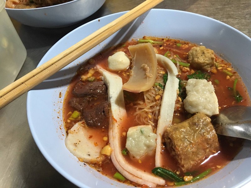 ร้านขายอยู่ใกล้ร้านทิพย์สมัย ผัดไทยประตูผี เป็นร้านรถเข็น ขายอยู่ด้านหน้าร้านรับจอดรถ มีโต๊ะนั่งทานริมทาง ลูกค้าเยอะ รอคิวพักนึง สั่งเมนูบะหมี่เย็นตาโฟต้มยำ 60฿ เครื่องเยอะ น้ำซุปอร่อย ไม่ต้องปรุงเพิ่ม เครื่องมีเลือด ปลาเส้น ปลาหมึกกรอบ ลูกชิ้นปลา ลูกชิ้นกุ้ง และเผือกทอดแบบฮ้อยจ้อ ลูกชิ้นปลาแท้อร่อย แนะนำค่ะดูเพิ่มเติม