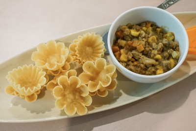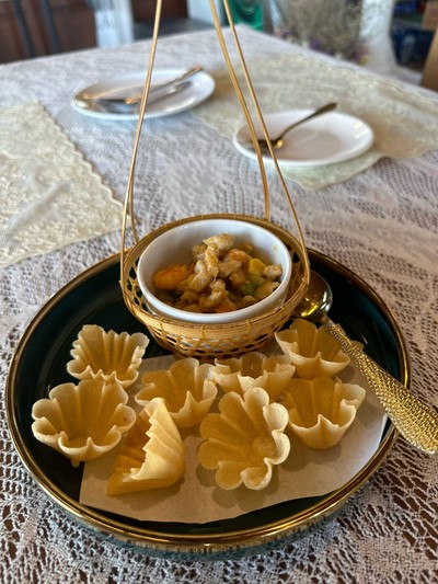 ตักไส้ใส่ในตัวกระทงทอง เคี้ยวกรอบกินเพลิน ตัวไส้เป็นไก่และกุ้งผัดกับรากผักชีกระเทียมพริกไทยหอมๆ