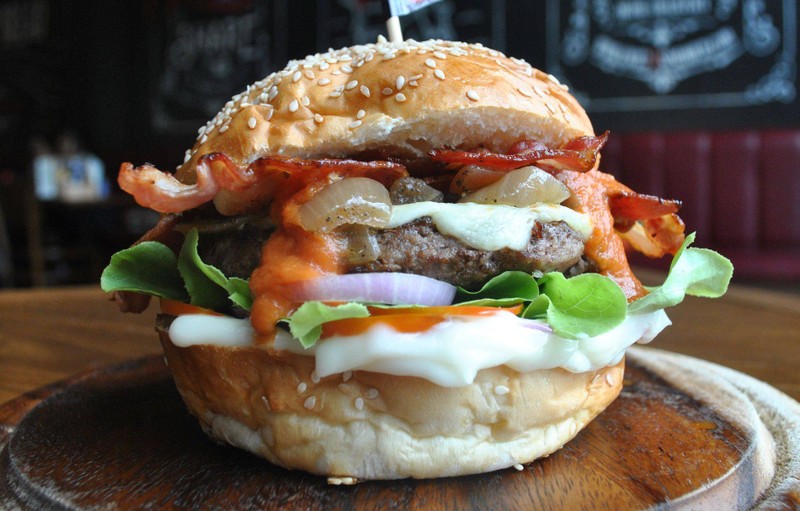 โฮมเมด ขนมปังเบอร์เกอร์ เนื้อออสเตเรีย ที่มีส่วนประกอบ จัดเต็มเป็น สลัด หอมหัวใหญ่ผัด มะเขือเทศ เบคอนย่างกรอบ ชีส และ โฮมเมด ซอส มาโย ซอส พริก