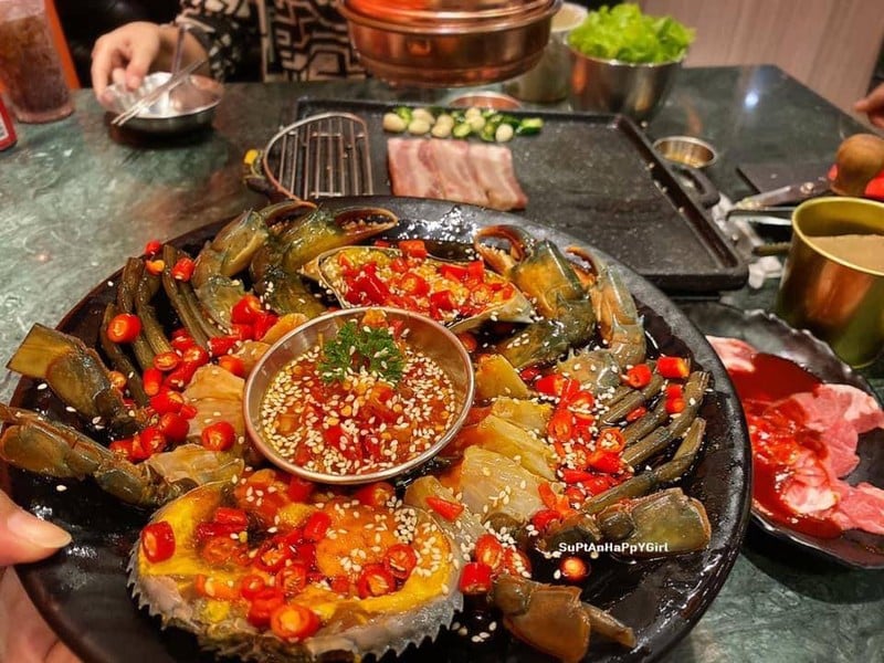 ร้านอาหารปิ้งย่างเกาหลีที่คนไทยนิยม วันนี้สั่ง set 999++ ที่มีหมู ข้าว ผัก และซุป และปูทะเลดอง 2 ต้ว 1000 ต้นๆ อาหารร้านนี้รสชาดดี แต่ราคาจะแรงส์ หากต้องการผักเพิ่มต้องเสียเงิน แต่เพิ่มพริก และกิมจิได้ฟรี ชอบกิมจิที่นี่เพราะไม่เปรี้ยว ส่วนข้าวสวย 40 บาทจ้ะดูเพิ่มเติม