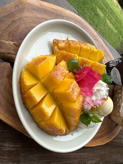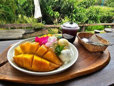 ร้านคาเฟ่ในเขาใหญ่ เข้าไปในซอยประมานสองกิโล มีลานจอดรถหน้าร้านจอดได้หลายคน ไปช่วงบ่ายคนเยอะ ร้านมีสองชั้น เข้ามานั่งชมวิวสวนมะม่วง มีมะม่วงขายและมีเมนูของหวานจากมะม่วงทเป็นข้าวเหนียวมะม่วง ข้าวเหนียวอร่อย ตัวมะม่วงหวานอมเปรี้ยวเข้ากันดี ตัวที่ทางร้านแนะนำเป็นมะม่วงย่างเนย มีน้ำตาลกรอบเป้นแผ่นเคลือบหน้าอยู่ ปอกมาให้กินเป็นคำๆแล้ว รสชาตแปลกใหม่อร่อยดี #Wongnaisongkran2023ดูเพิ่มเติม